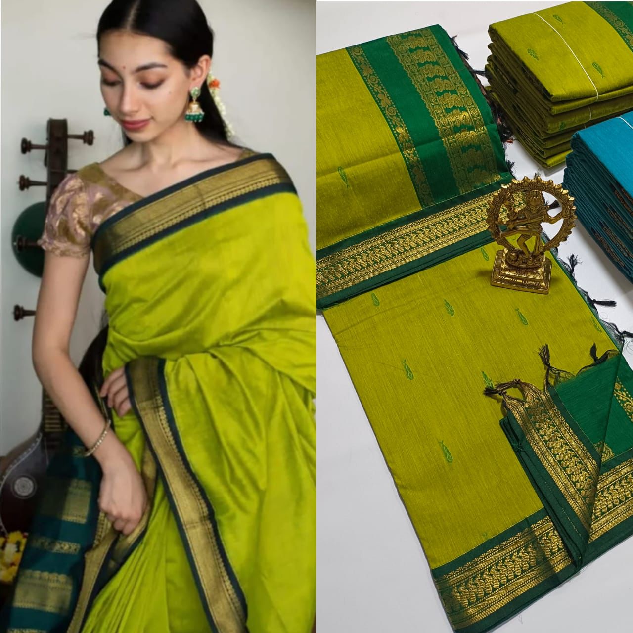 Embrace effortless grace with the Dyuthi Kalyani Cotton Saree, crafted from soft cotton with elegant zari detailing for timeless charm.