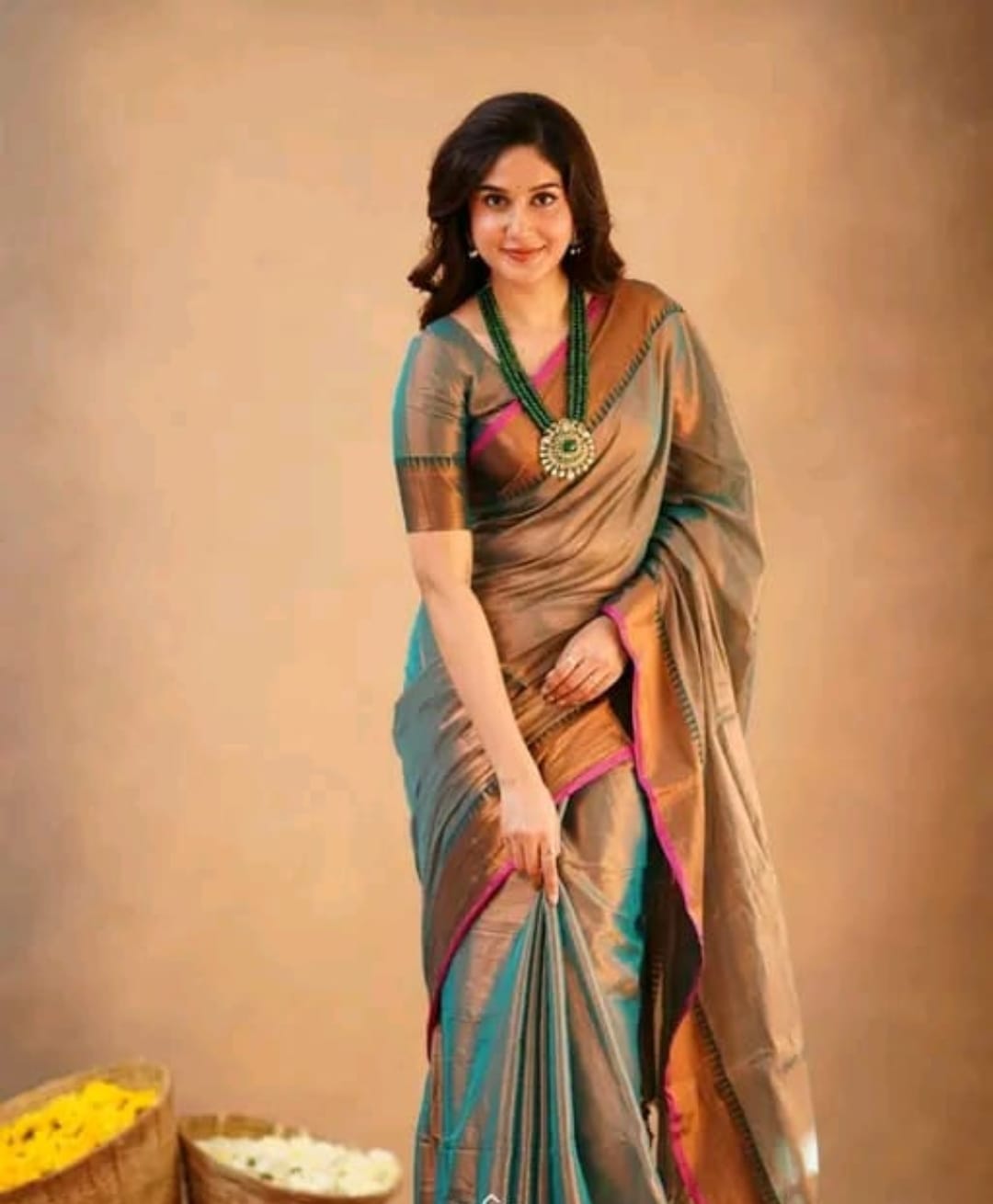 Drape yourself in sheer elegance with the Dyuthi Mul Tissue Saree, featuring a luxurious tissue fabric adorned with delicate zari work.