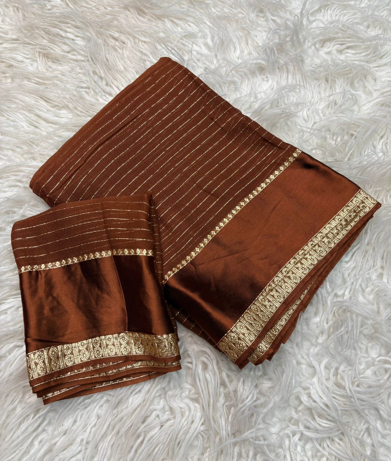 A graceful saree crafted from pure viscose georgette, featuring elegant stripe lining patterns and a smooth satin border.